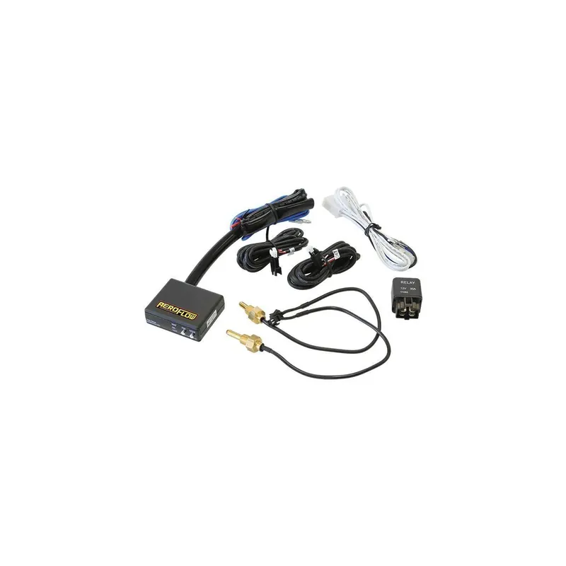 The Aeroflow Performance Electronic Fan Controller allows the user to control aftermarket electronic cooling fans. This unit can control only one fan and can set the fan to turn on or off at preset temperatures.
