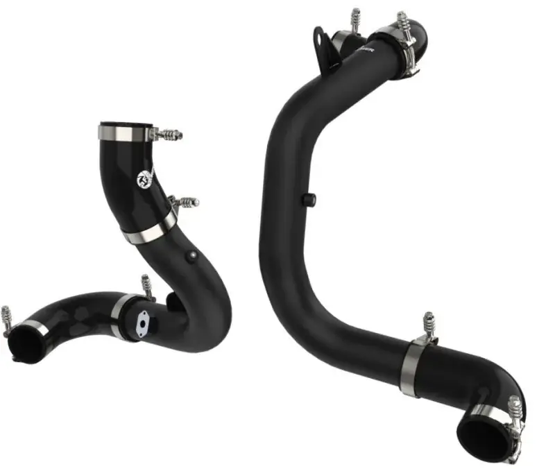 Smooth transitions in the mandrel-bent aluminum tubing decrease turbulence and minimize pressure loss, increasing horsepower and torque. The BladeRunner I/C tube kit provides a smooth transition between the turbo and the engine for lower operating temperatures and increased power. This tube kit includes high-quality, stainless-steel, spring-loaded T-bolt clamps and heavy-duty, 5-ply, polyester reinforced silicone couplings for superior strength and durability. Finished in Wrinkle Black powder coating with a unique laser-etched aFe Power logo for a custom look.