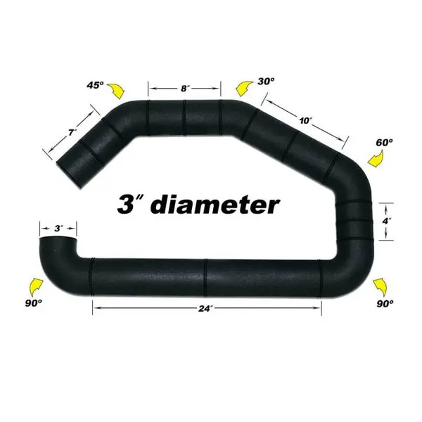 The UBI Air Intake Tube Set is a one-piece air intake tube consisting of the bends and straight pipes needed for you to create the intake piping of a custom air intake system. The roto-molded tube is a low-restriction, free-flowing tube with a 3 inch outside diameter. Simply measure and cut off the pieces you need.