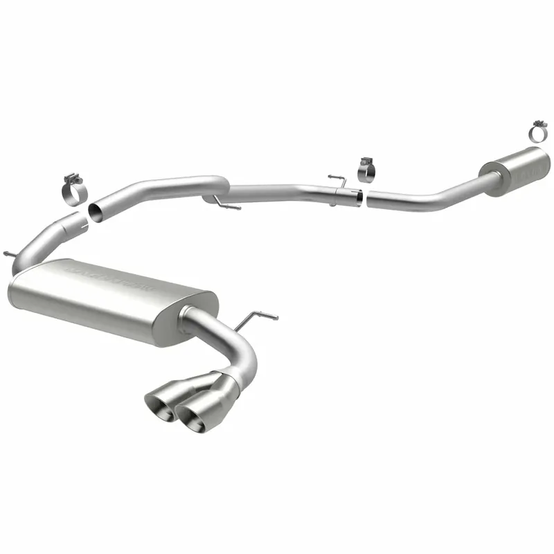 The MagnaFlow 2012-2018 Ford Focus Street Series Cat-Back Performance Exhaust System 15072 brings out the personality of your 2.0L 2012-2018 Ford Focus with our signature resonant, powerful engine tone and dyno-proven performance. Thanks to its fast-flowing, mandrel bent 2.25in. main piping and 2 Straight-Through mufflers ending in a Single Straight Passenger Side Rear exit with 3in. Polished Welded-On Double Wall Angle Cut Folded Edge tips, this Ford Focus exhaust kit has the performance chops to match its sporty sound and appearance. Upgrade your ride to the next level with an exhaust that has the pipes to put other Ford Focus’s to shame. With this system your vehicle will be producing Moderate exterior and Mild interior sound levels while leaving other cars and trucks feeling envious at every stoplight. Exhaust kit 15072 features a cat-back layout that replaces your ride’s stock exhaust components from near the catalytic converter on back. Extensive 3D scanning during development has resulted in a direct-fit design that you can easily install yourself. 15072 is produced using CNC precision robotic manufacturing techniques and is backed by MagnaFlow’s 1-year limited finish warranty and limited lifetime construction warranty.