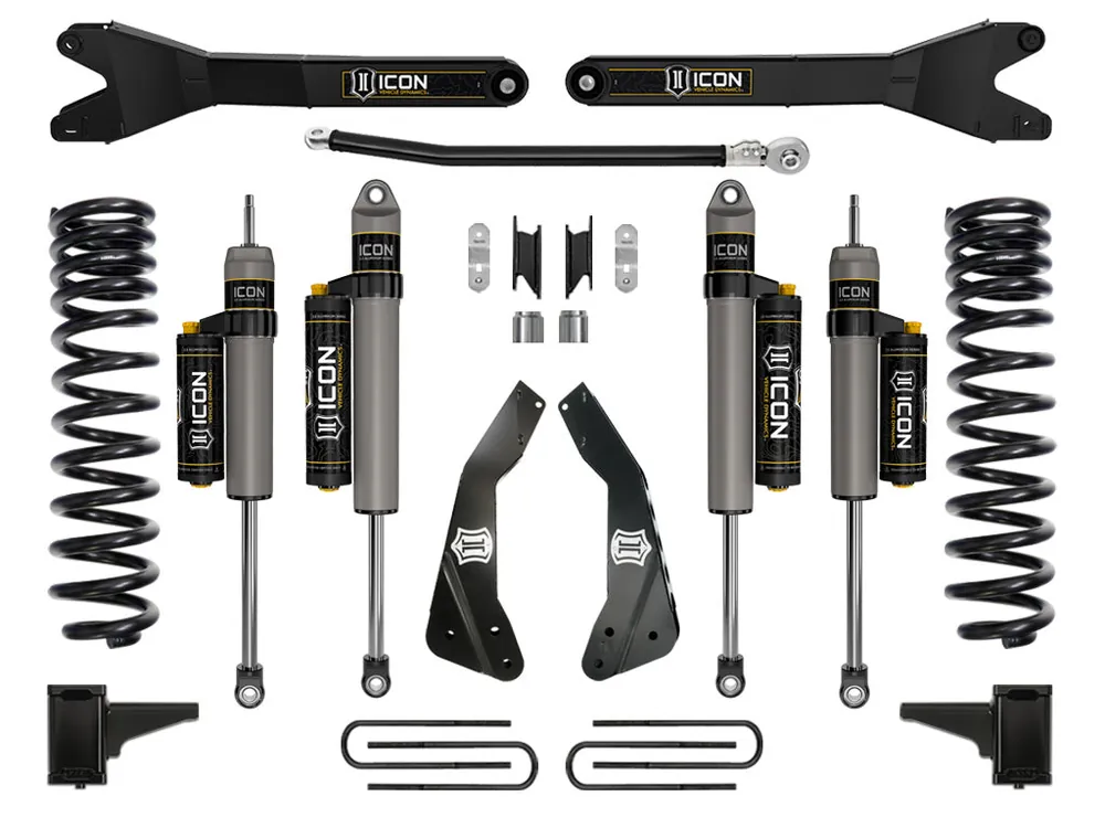 This Stage 4 system sees the inclusion of the ICON Vehicle Dynamics Ford Super Duty Radius Arm System that feature a sealed pivot bushing that minimizes road feedback and ensures a long life and quiet operation. Additionally, their fabricated, fully boxed design ensures strength and utilizes a profile optimized for tire clearance at full steering lock, making a 37” tall tire clear without coming in contact with the radius arm.