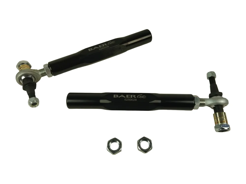 The Baer “Tracker” adjustable tie-rods feature 6061 T-6 aluminum, fully machined sleeve with a black anodized finish, a Teflon lined 5/8” heim joint and 4140 steel pin which. The pin is machined with the correct taper so no modification to the OE spindles is required and then heat treated. The Trackers Tie Rods are vehicle specific, mounting to the OE inner tie rod and offer approximately .875” of adjustment at the spindle to help correct bump steer issues due to modified suspensions and/or poor OE design. Best of all these are made in the USA!