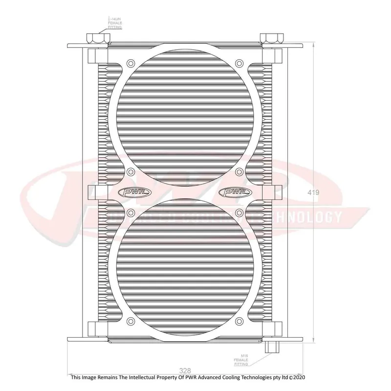 Modern engines run higher oil temperatures and rely on engine oil to assist the water system in cooling the engine. PWRs patented plate and fin engine oil coolers are made from 100% aluminium construction which allows the cooler to be made strong, lightweight and compact while offering high heat transfer and powdercoated for corrosion resistance. The plate design turbulates the oil flow and in conjunction with the unique louvered fin design provides unequalled heat rejection while offering very low-pressure drop. Manufactured with a 37mm core, these coolers are perfect for engine oil cooling, heavy duty automatic transmission cooling, power steering and differential cooling for race and road applications. All coolers come standard with Dash -10 AN & Dash -12 AN male adapters with Dash -6 AN & Dash -8 AN being alternative options. Custom versions can be special ordered with thermo fan mounts with or without thermo switch bosses.