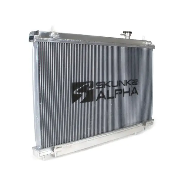 Skunk2’s all-aluminum, full-size Alpha Series Radiator for the ’03-’06 350z is a direct-fit upgrade designed to dramatically increase both cooling efficiency and engine performance. Alpha Series Radiators are manufactured from lightweight and durable aluminum, feature 100-percent brazed cores, and include polished end tanks with Skunk2’s signature Alpha logo embossed along each side. Each Alpha Series Radiator features a dual-core design, high-efficiency fins for maximum cooling capabilities. Each Alpha Series Radiator also includes provisions for the OEM cooling fan and OEM-compatible, 1.50- in. inlets and outlets.Skunk2’s commitment to producing high-quality components means that each Alpha Series Radiator meets or exceeds original equipment manufacturer standards, that each radiator may be installed without modification to the vehicle, and is compatible with OEM hoses, cooling fans, and shrouds. (Note: Some engine swap applications may require custom radiator hoses and/or cooling fans.) Skunk2’s Alpha Series Radiators are the perfect addition to any high-performance vehicle and are designed for the street, the track, or even OEM replacement purposes. Alpha Series Radiators are built to withstand harsh elements as well as against years of under-hood heat cycling. Each Alpha Series Radiator adheres to strict quality control standards and careful packaging, resulting in tubes and fins capable of optimal flow and efficient heat transfer.