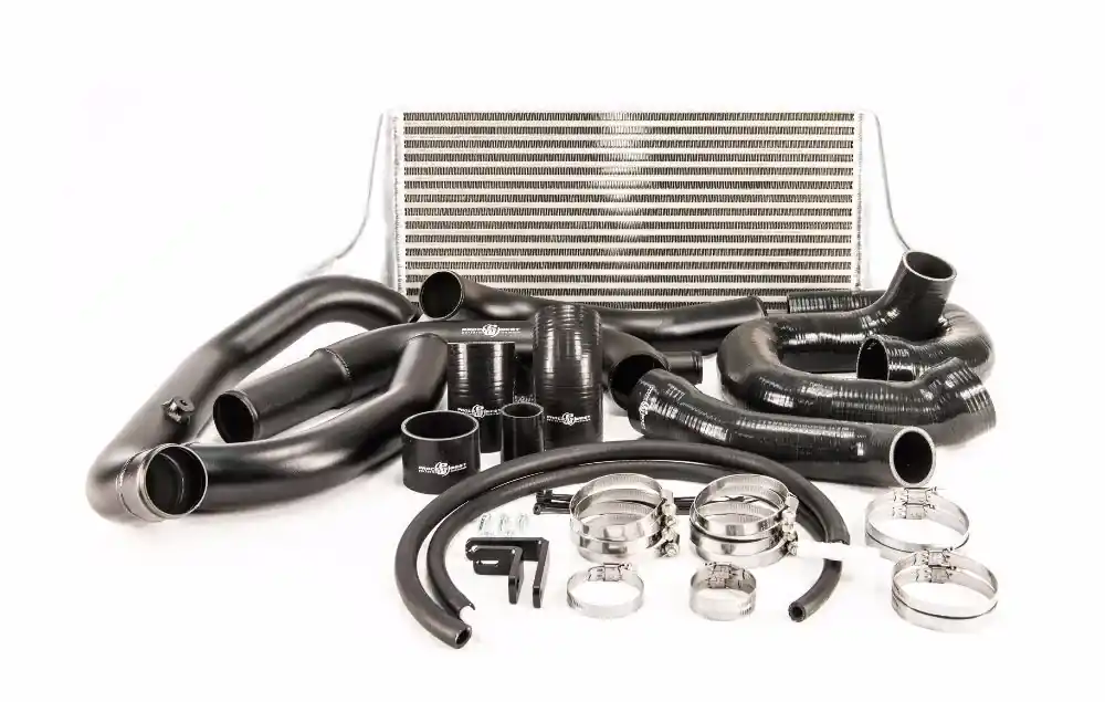 The Process West Front Mount Intercooler Kit for the 08-14 Subaru STI includes a 620 x 255 x 90mm bar & plate intercooler core, with hi-flow polished aluminium end tanks. This allows for smooth flow and effective cooling of the charge air entering the engine. Along with mandrel bent aluminium piping this Front Mount Intercooler Kit offers one of the best off-the-shelf options for the 08-14 STI on the market.