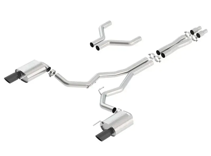 EXCEPT Convertible. Recommended only for vehicles with substantial engine upgrades that require a 3″ exhaust. System contains a merge X-Pipe for increased performance and improved sound. This system features 4″ black chrome on T-304 stainless steel tips. Using BORLA Stainless Steel Polish p# 21461 is NOT recommended with these black chrome tips. We suggest cleaning the tips with hot water and a microfiber cloth. BORLA Cat-Back and Axle-Back exhaust systems feature patented straight-through and multi-core technology designed to unleash hidden horsepower. Increased exhaust velocity adds power, driving excitement, fuel economy, and the distinctive BORLA Sound of Power respected by motoring enthusiasts everywhere.